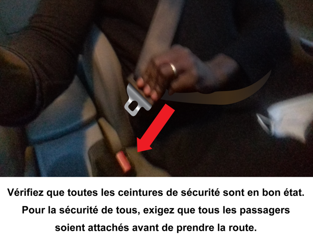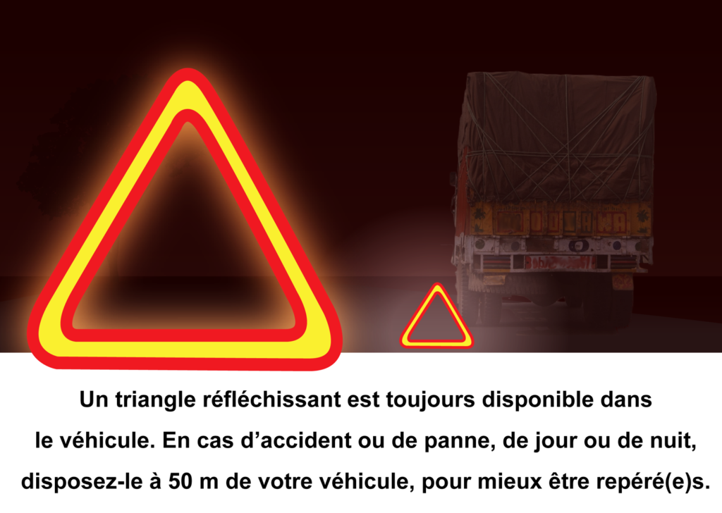 Il est nécessaire de s’équiper avec du matériel réglementaire et bien entretenu, pour la prévention des accidents de la circulation. De plus, observez et faites respecter les règles de sécurité à tous les passagers avant et pendant le voyage.